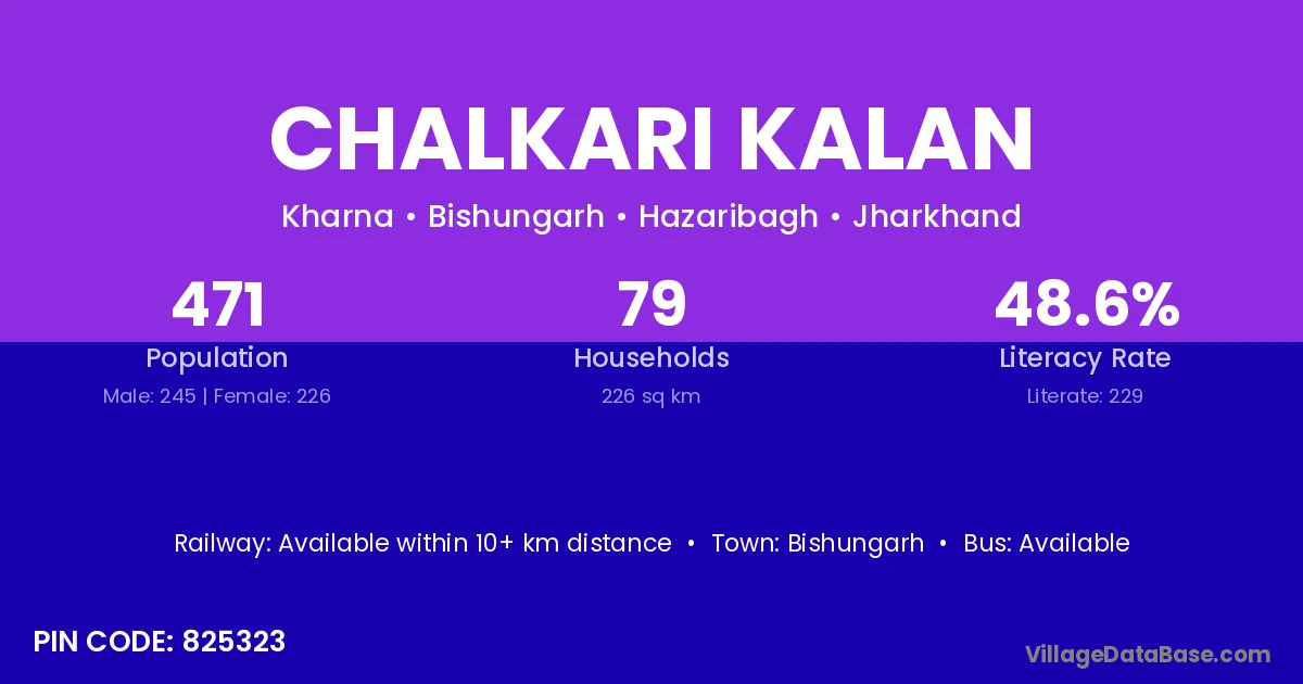 Chalkari Kalan village has a total population of 471 people, of which 245 are males and 226 are females.