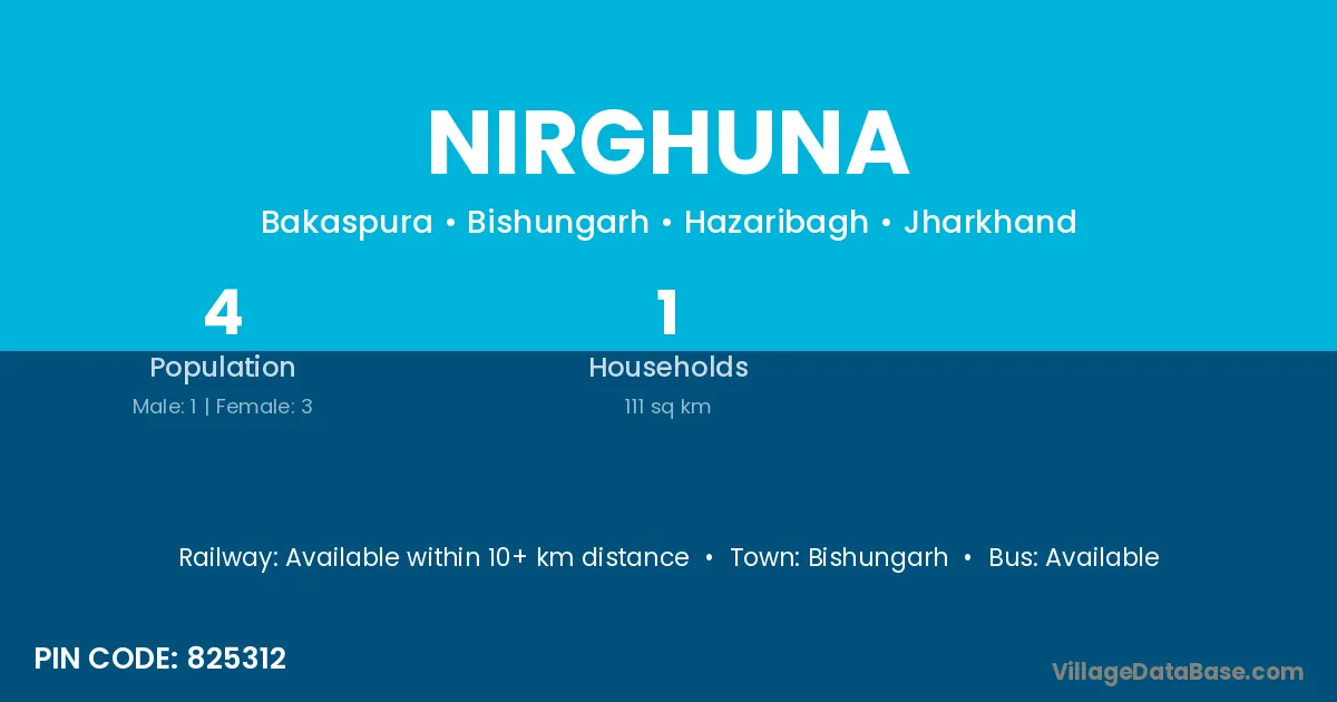 Nirghuna village has a total population of 4 people, of which 1 are males and 3 are females.