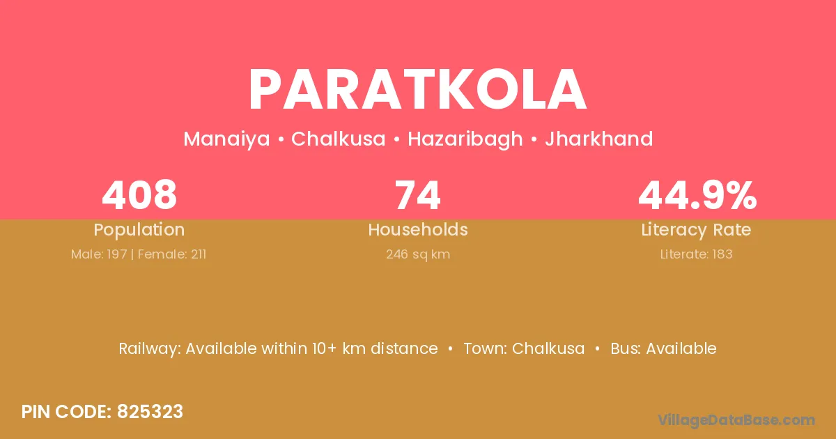 Paratkola village has a total population of 408 people, of which 197 are males and 211 are females.