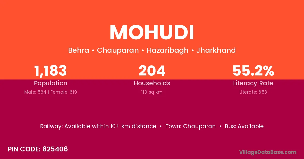 Mohudi village has a total population of 1,183 people, of which 564 are males and 619 are females.