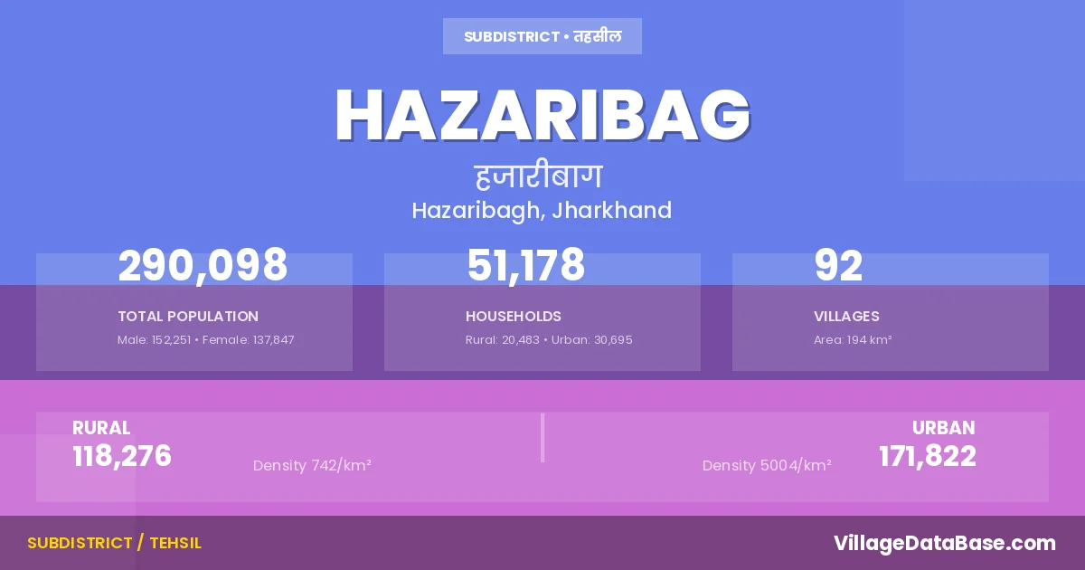 According to the 2011 census The total area of Hazaribag Subdivision is 194 km², with a population of 290098 people. The population density is 1,498 inhabitants per square kilometre, and there are approximately 51178 houses in the sub district.