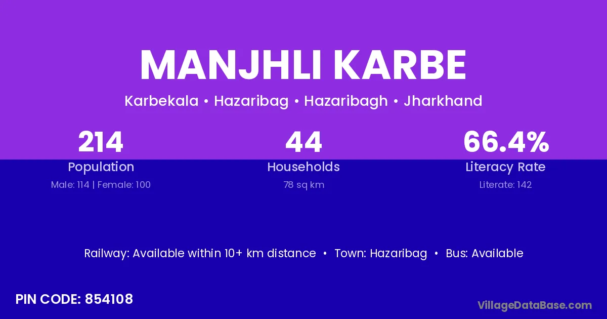 Manjhli Karbe village has a total population of 214 people, of which 114 are males and 100 are females.