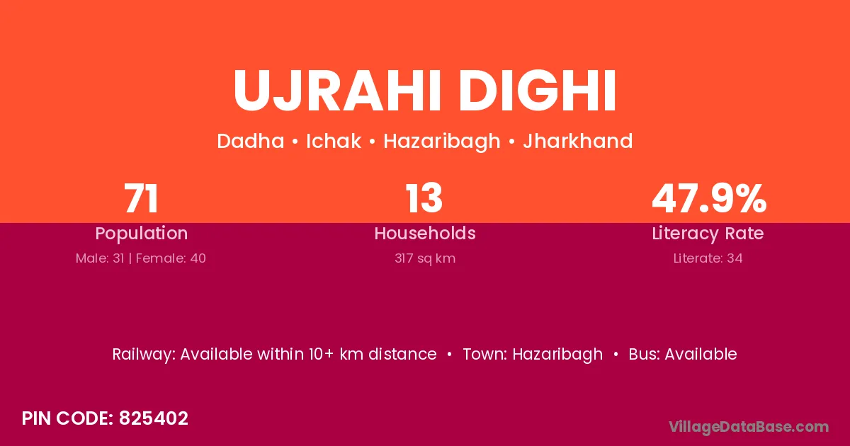 Ujrahi Dighi village has a total population of 71 people, of which 31 are males and 40 are females.