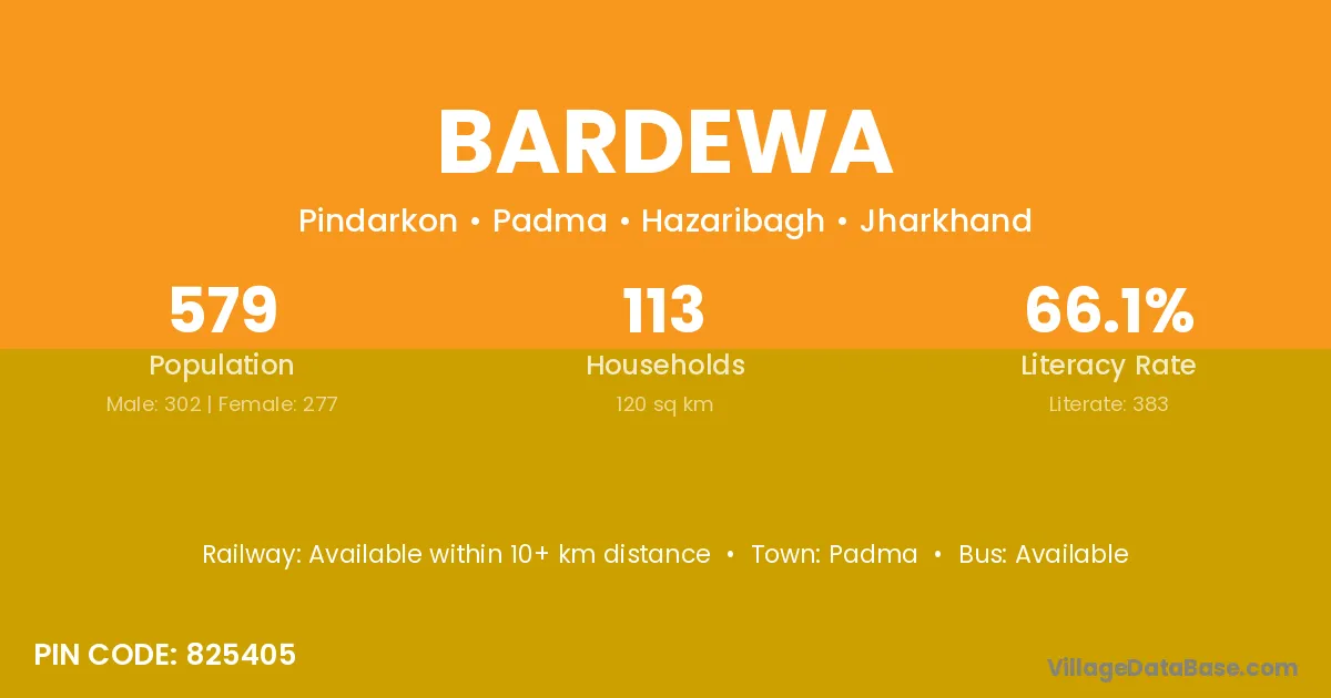 Bardewa village has a total population of 579 people, of which 302 are males and 277 are females.