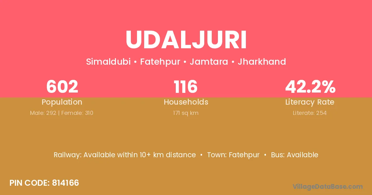 Udaljuri village has a total population of 602 people, of which 292 are males and 310 are females.