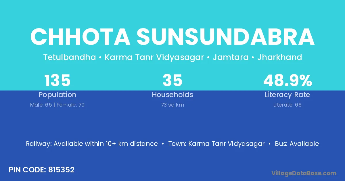 Chhota Sunsundabra village has a total population of 135 people, of which 65 are males and 70 are females.