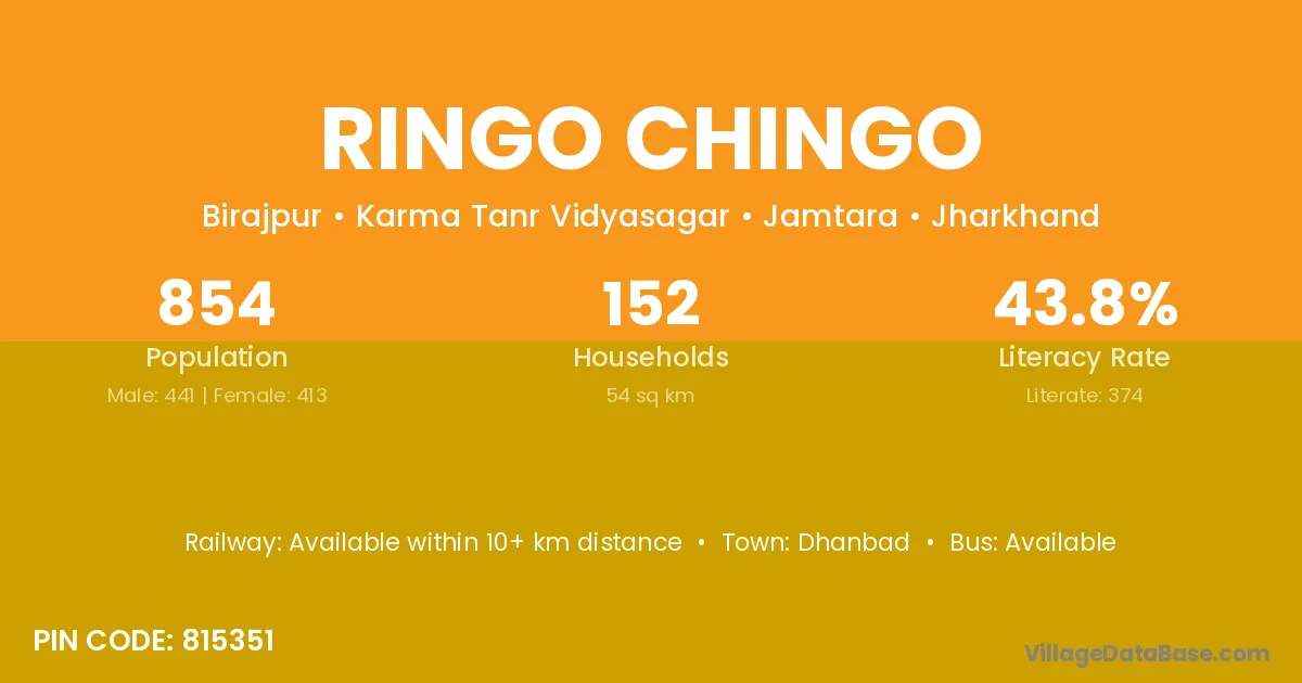 Ringo Chingo village has a total population of 854 people, of which 441 are males and 413 are females.