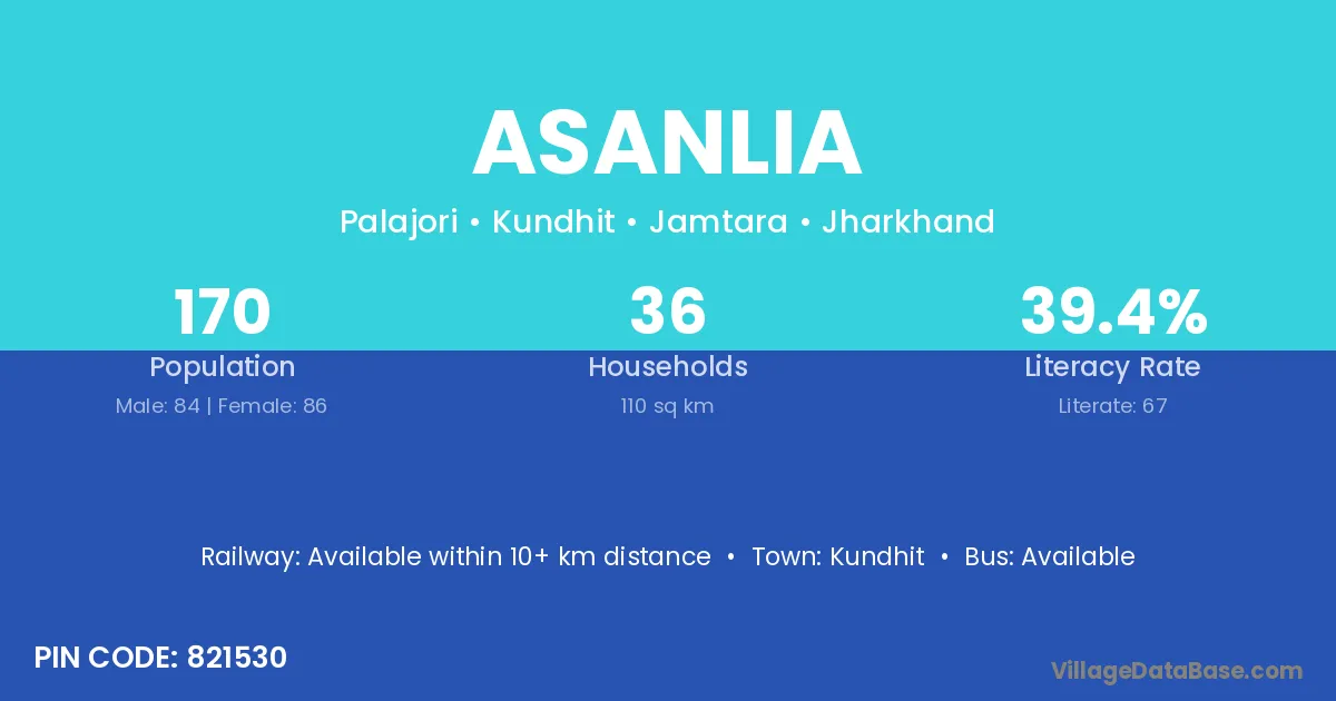 Asanlia village has a total population of 170 people, of which 84 are males and 86 are females.