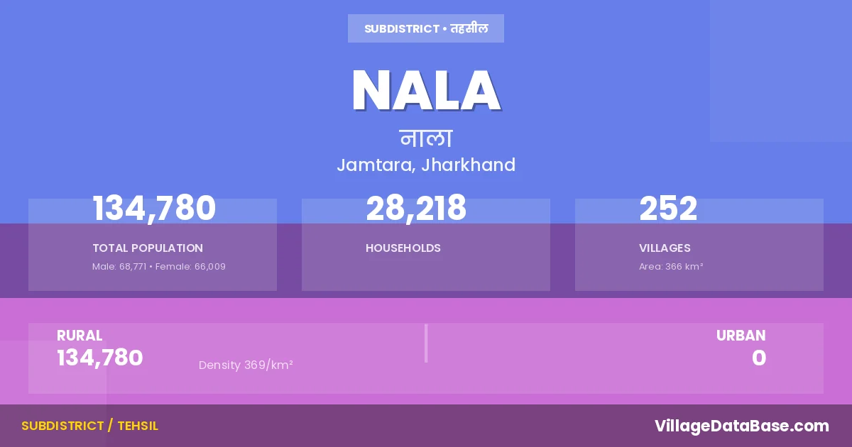 According to the 2011 census The total area of Nala Subdivision is 366 km², with a population of 134780 people. The population density is 369 inhabitants per square kilometre, and there are approximately 28218 houses in the sub district.