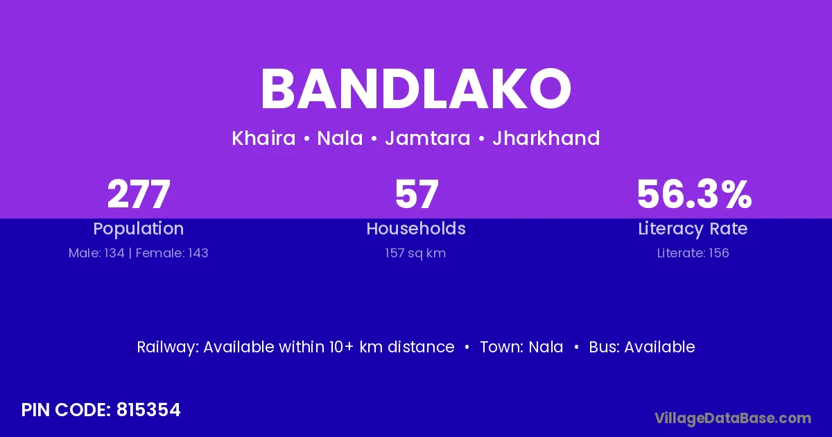 The literacy rate of Bandlako village is 56.32%. Male literacy stands at 73.88% and female literacy at 39.86%.