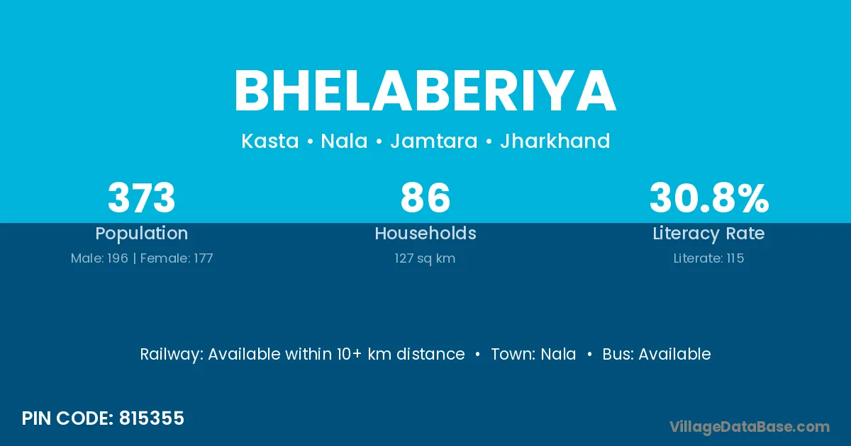 Bhelaberiya village has a total population of 373 people, of which 196 are males and 177 are females.