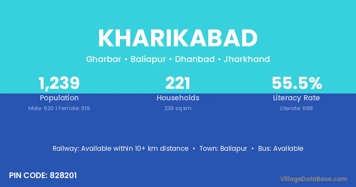 The literacy rate of Kharikabad village is 51.94%. Male literacy stands at 62.86% and female literacy at 38.98%.