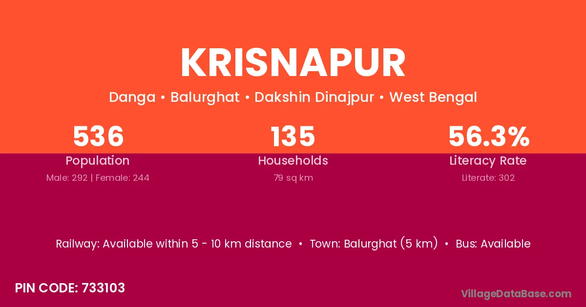 The literacy rate of Krisnapur village is 51.23%. Male literacy stands at 60.00% and female literacy at 42.78%.