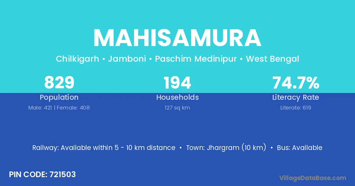 The literacy rate of Mahisamura village is 40.97%. Male literacy stands at 50.45% and female literacy at 32.22%.