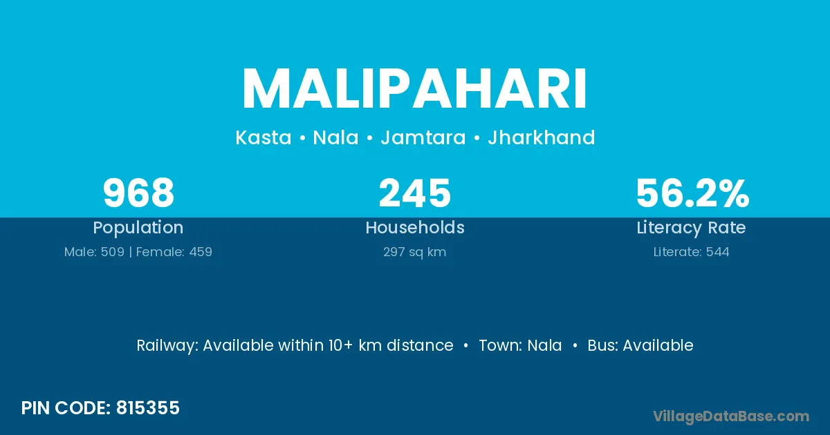 Malipahari village has a total population of 968 people, of which 509 are males and 459 are females.