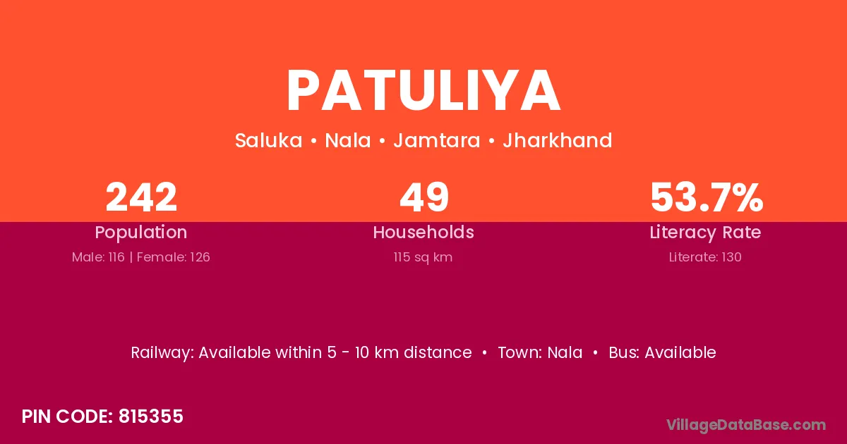 Patuliya village has a total population of 242 people, of which 116 are males and 126 are females.