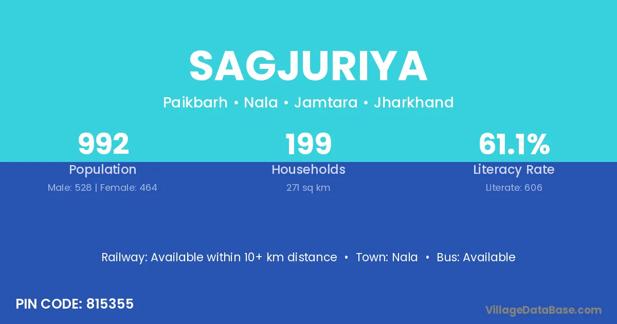 Sagjuriya village has a total population of 992 people, of which 528 are males and 464 are females.