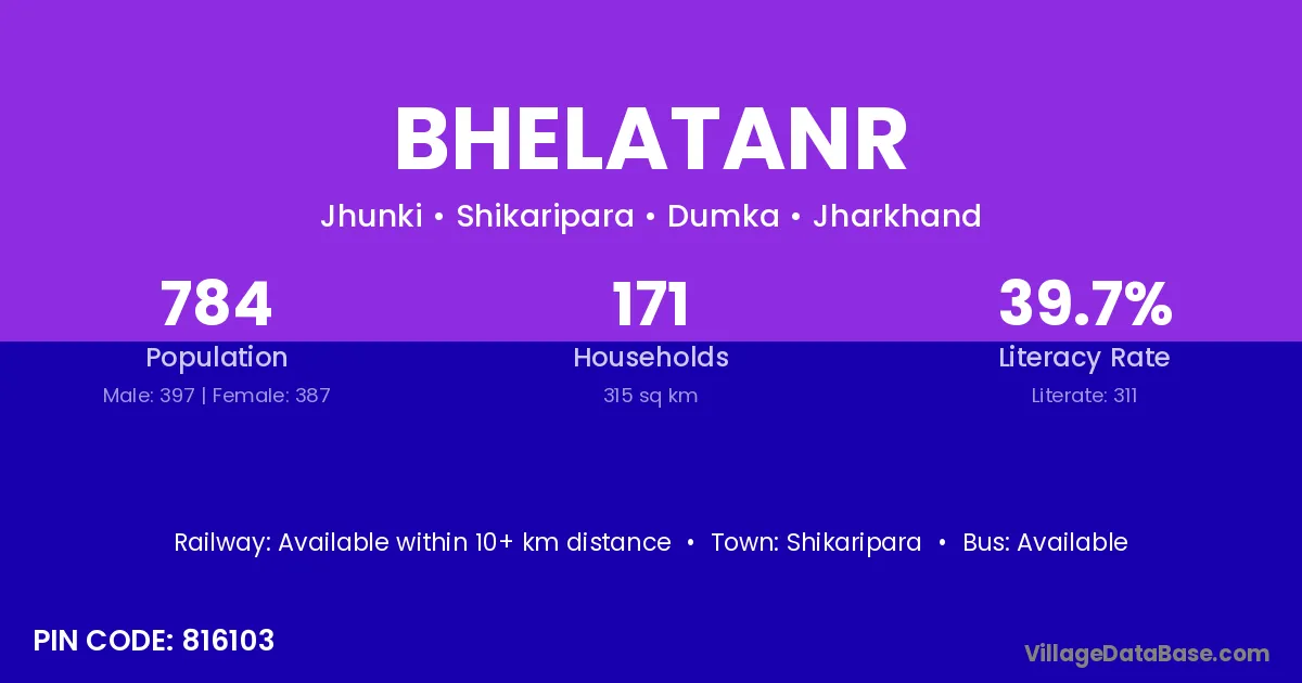 Bhelatanr village has a total population of 790 people, of which 397 are males and 393 are females.