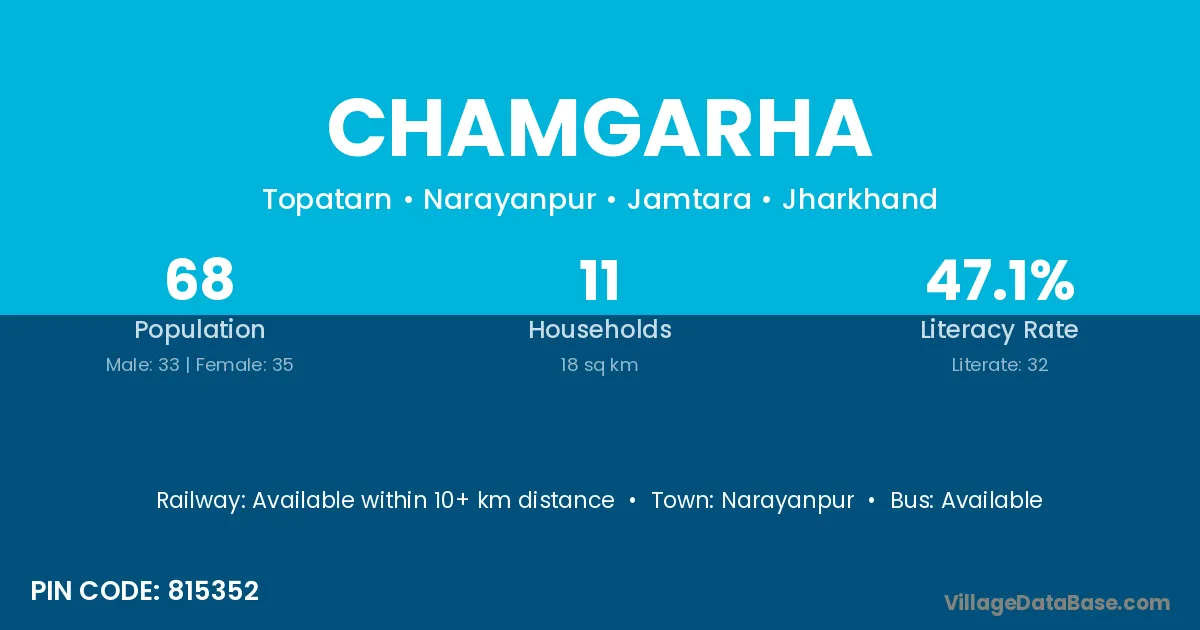 Chamgarha village has a total population of 68 people, of which 33 are males and 35 are females.