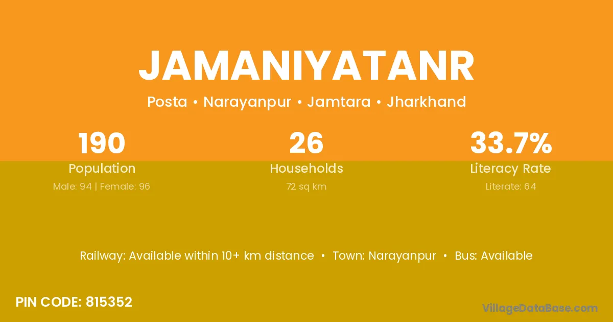 The literacy rate of Jamaniyatanr village is 33.68%. Male literacy stands at 47.87% and female literacy at 19.79%.