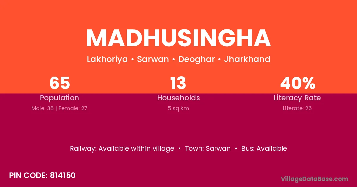 Madhusingha village has a total population of 548 people, of which 274 are males and 274 are females.