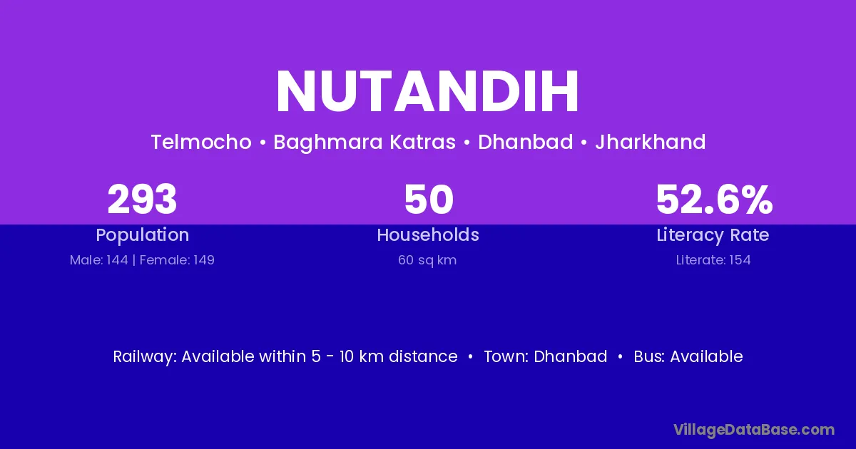 The literacy rate of Nutandih village is 44.36%. Male literacy stands at 58.33% and female literacy at 30.60%.
