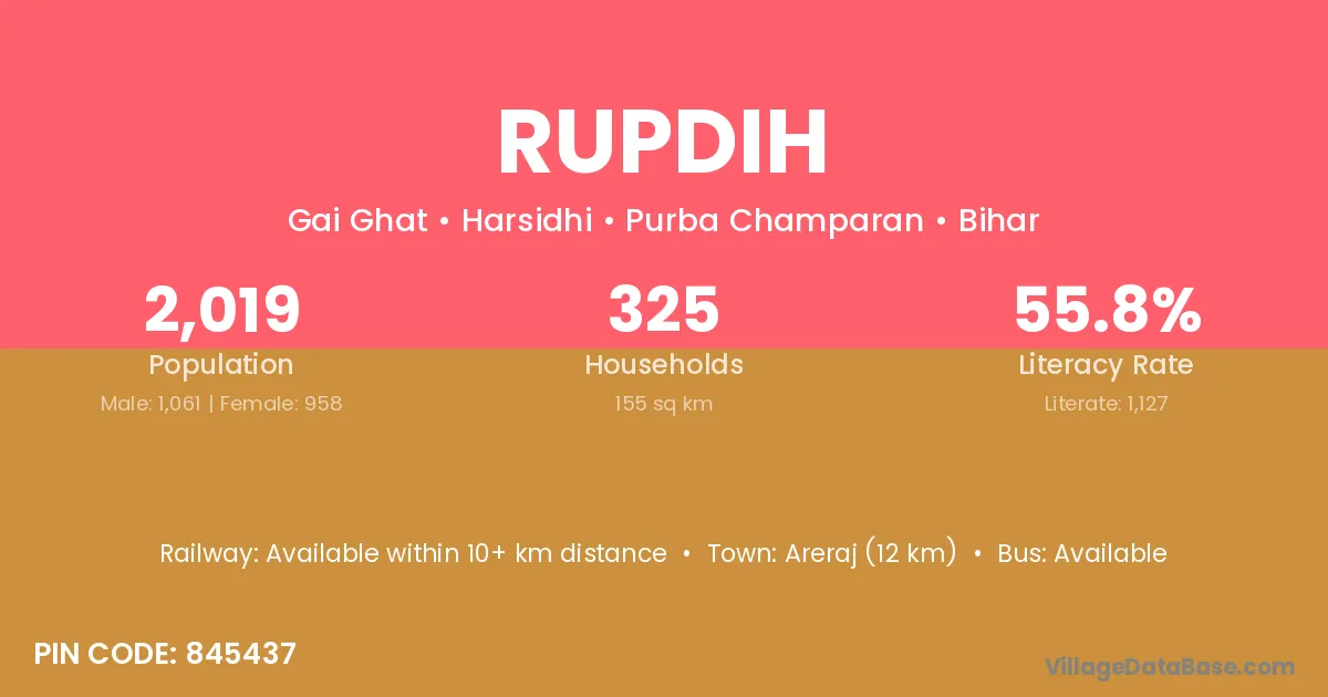 The literacy rate of Rupdih village is 54.49%. Male literacy stands at 64.93% and female literacy at 43.27%.