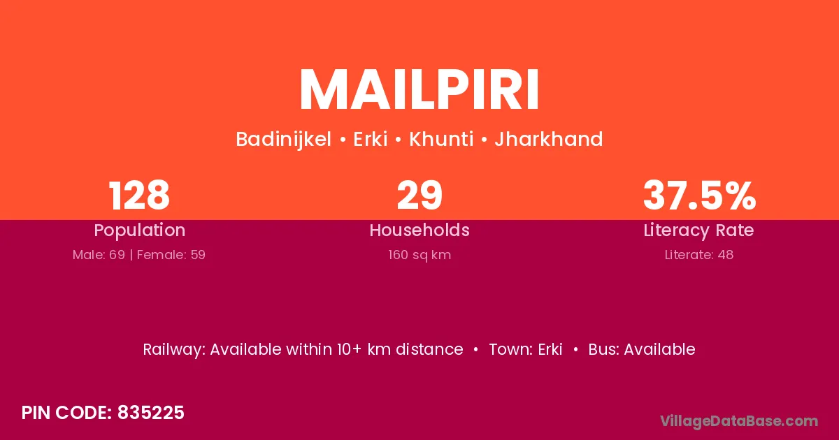 Mailpiri village has a total population of 128 people, of which 69 are males and 59 are females.