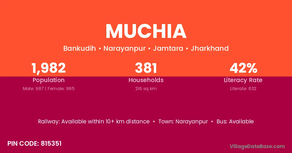 The literacy rate of Muchia village is 30.99%. Male literacy stands at 42.08% and female literacy at 20.62%.