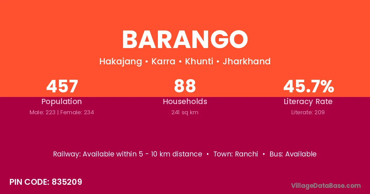 Barango village has a total population of 457 people, of which 223 are males and 234 are females.