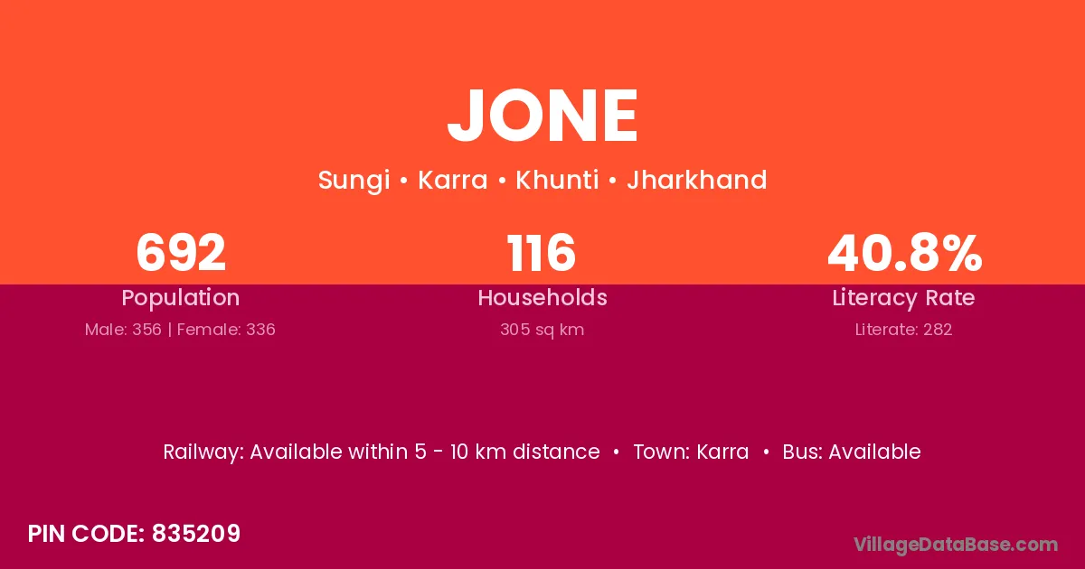 The literacy rate of Jone village is 40.75%. Male literacy stands at 50.00% and female literacy at 30.95%.