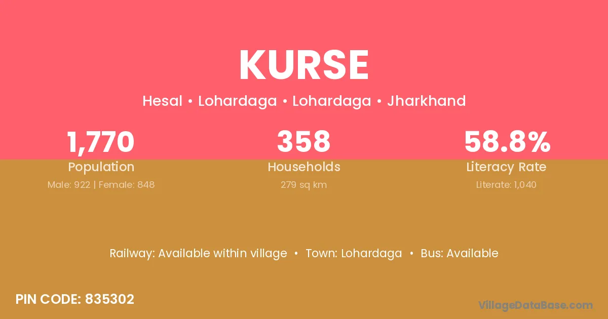 The literacy rate of Kurse village is 50.47%. Male literacy stands at 59.20% and female literacy at 41.76%.