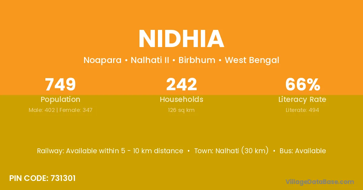 Nidhia village has a total population of 489 people, of which 237 are males and 252 are females.