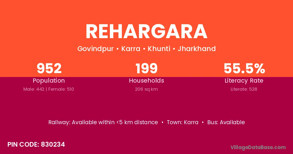 Rehargara village has a total population of 952 people, of which 442 are males and 510 are females.