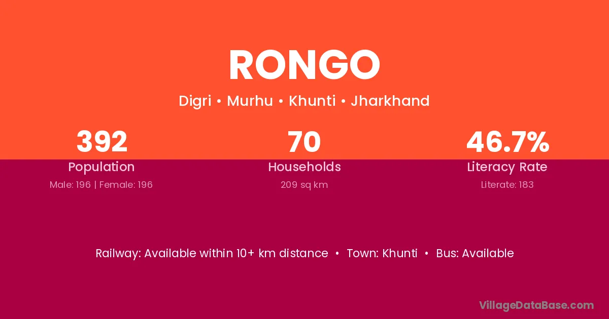 Rongo village has a total population of 392 people, of which 196 are males and 196 are females.