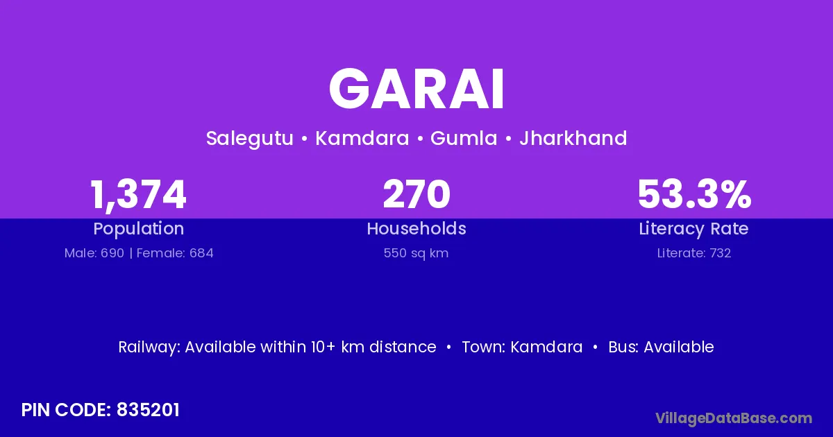 The literacy rate of Garai village is 54.12%. Male literacy stands at 61.90% and female literacy at 46.73%.