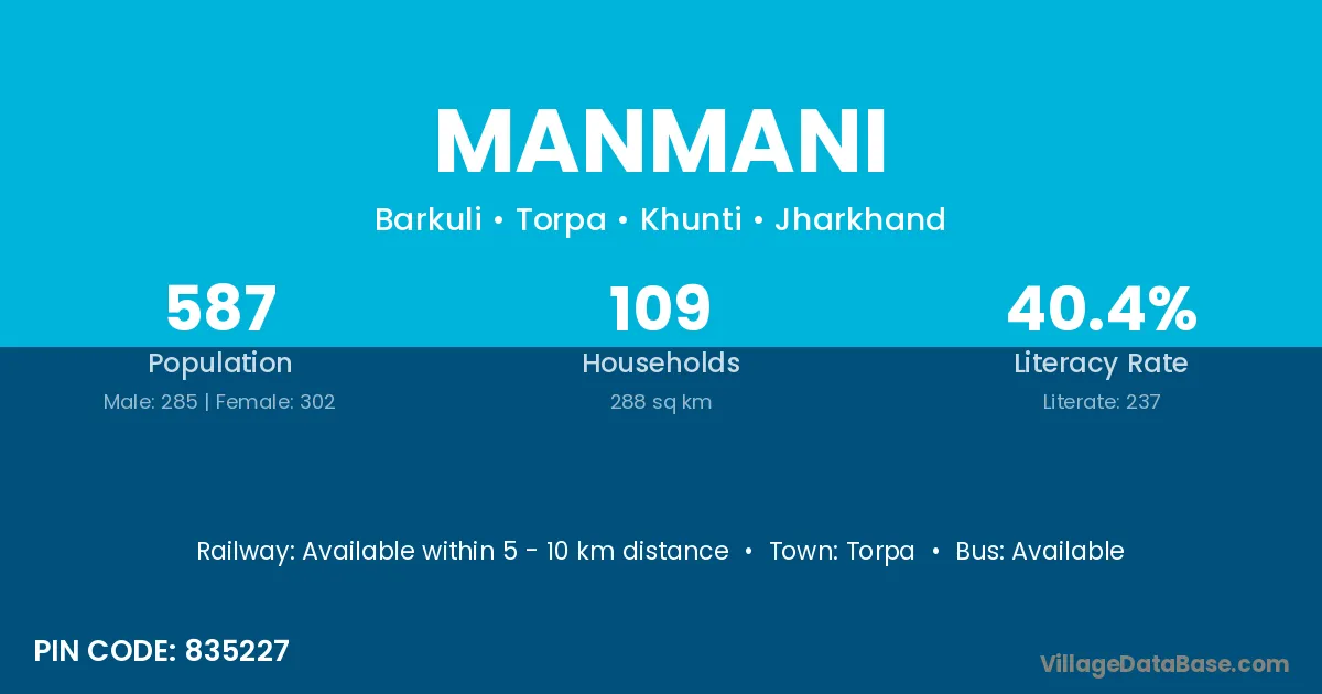 Manmani village has a total population of 587 people, of which 285 are males and 302 are females.