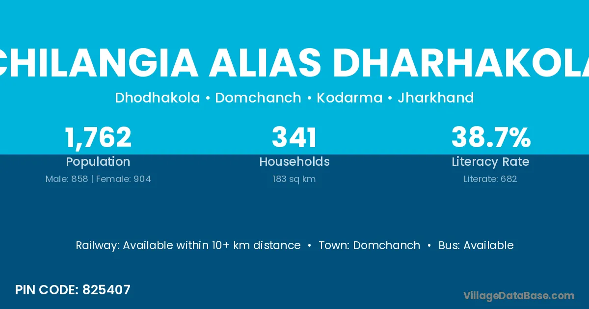 Chilangia Alias Dharhakola village has a total population of 1,762 people, of which 858 are males and 904 are females.