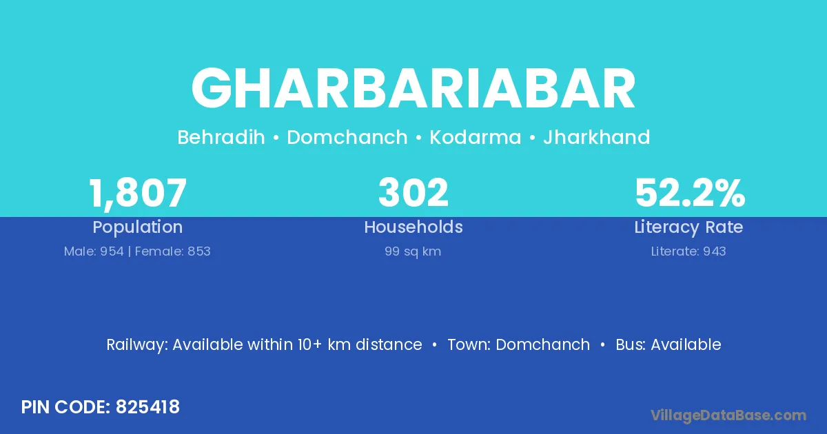Gharbariabar village has a total population of 1,807 people, of which 954 are males and 853 are females.