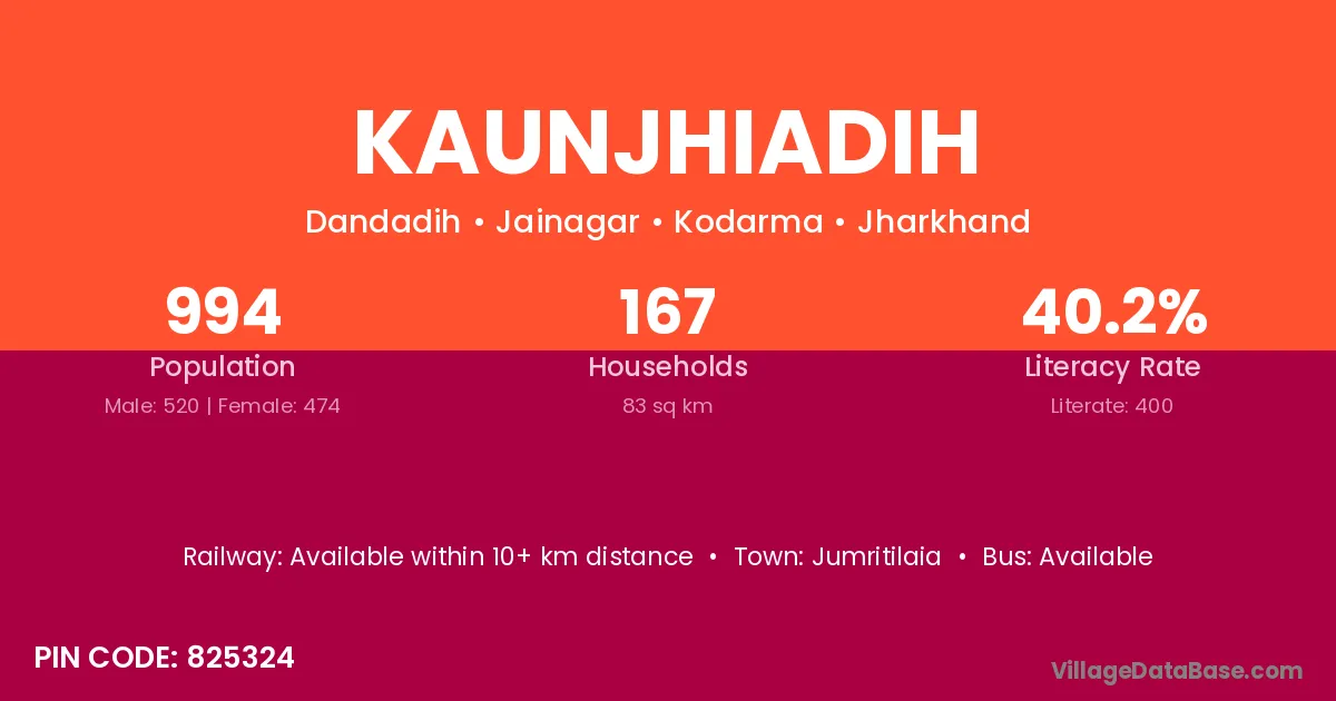 Kaunjhiadih village has a total population of 994 people, of which 520 are males and 474 are females.
