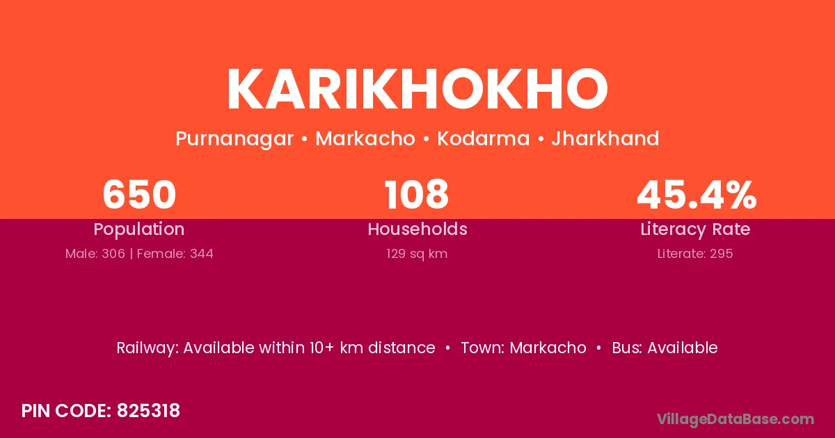 Karikhokho village has a total population of 650 people, of which 306 are males and 344 are females.