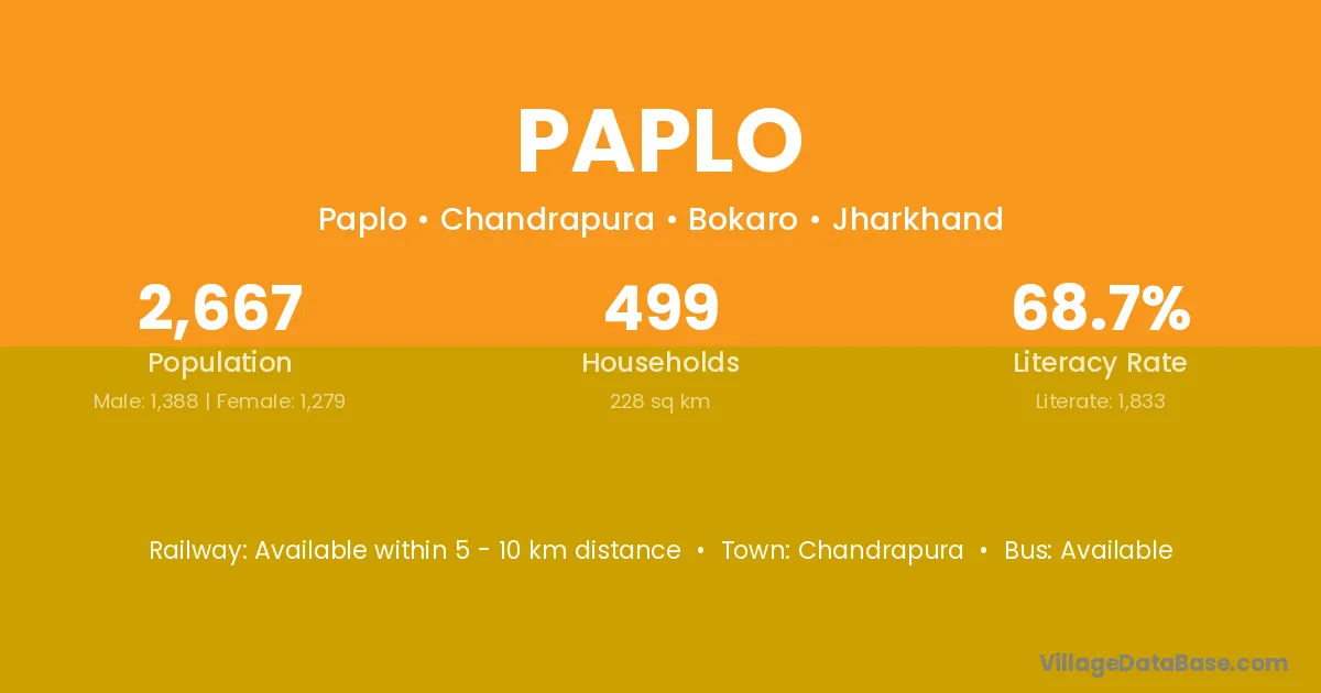The literacy rate of Paplo village is 50.40%. Male literacy stands at 61.85% and female literacy at 39.47%.