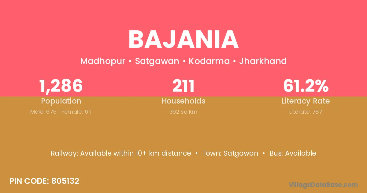 Bajania village has a total population of 1,286 people, of which 675 are males and 611 are females.