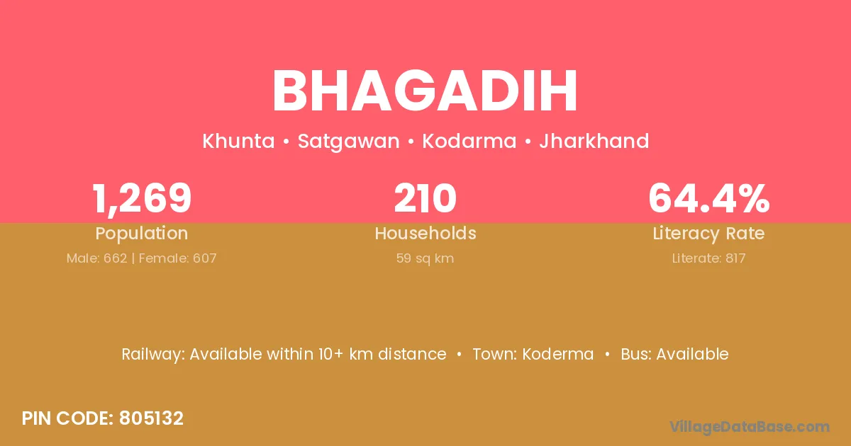Bhagadih village has a total population of 1,269 people, of which 662 are males and 607 are females.