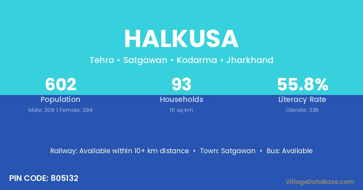 Halkusa village has a total population of 602 people, of which 308 are males and 294 are females.