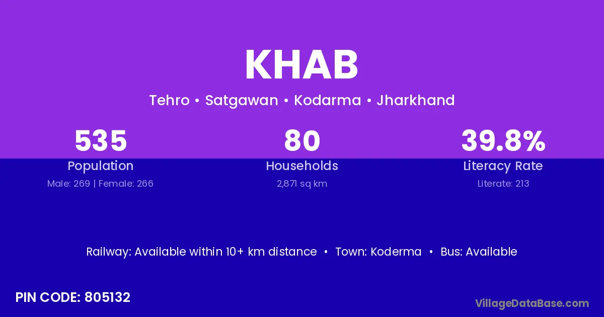 The literacy rate of Khab village is 39.81%. Male literacy stands at 55.39% and female literacy at 24.06%.