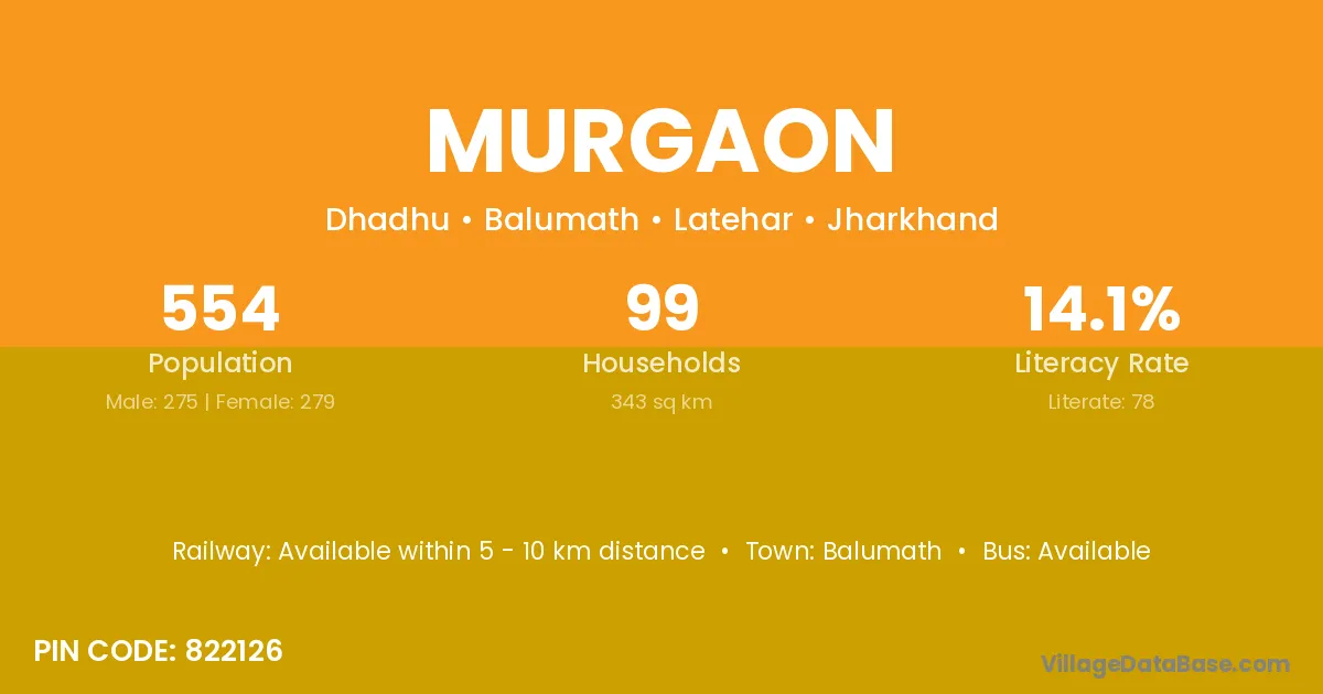 Murgaon village has a total population of 554 people, of which 275 are males and 279 are females.