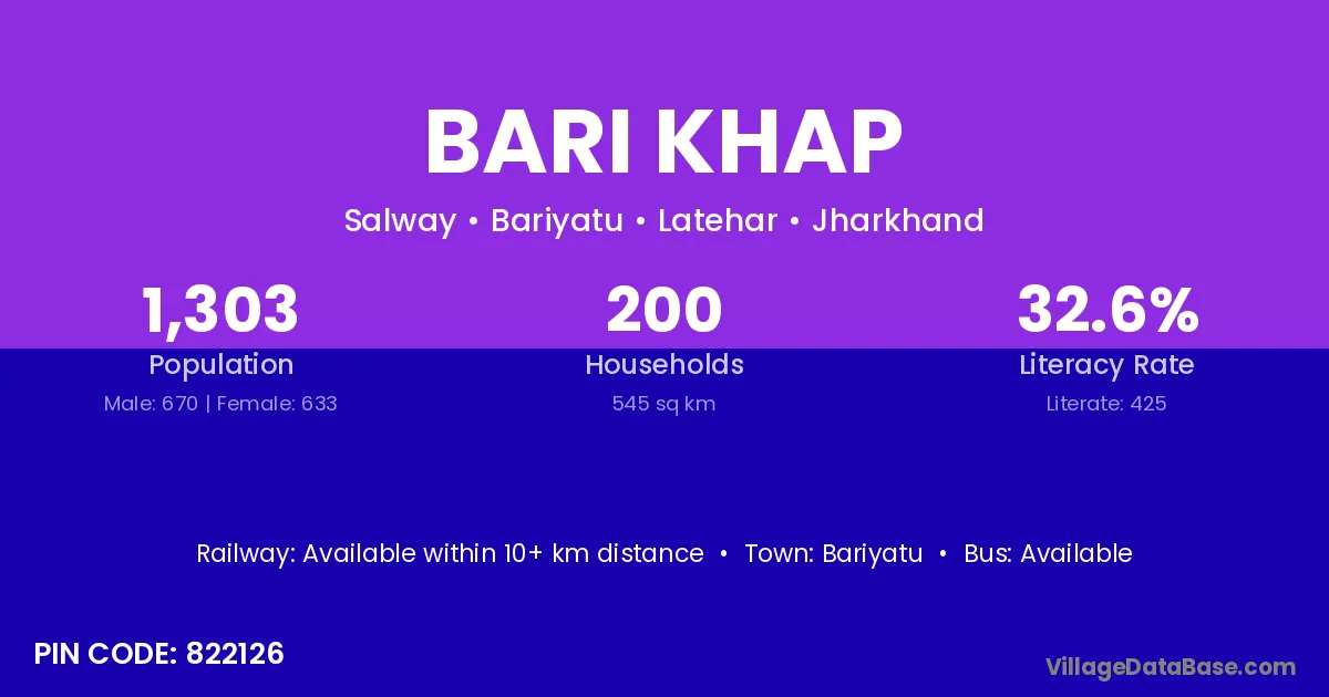 Bari Khap village has a total population of 1,303 people, of which 670 are males and 633 are females.