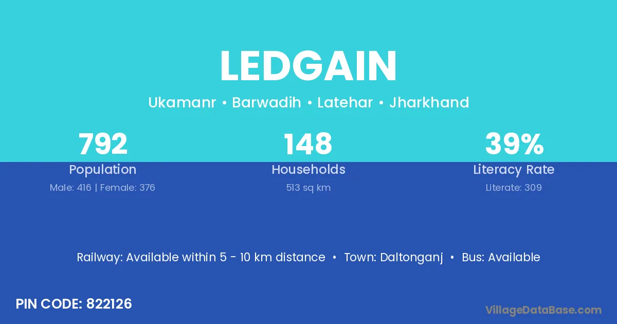 The literacy rate of Ledgain village is 39.02%. Male literacy stands at 52.88% and female literacy at 23.67%.
