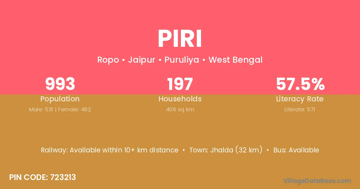 The literacy rate of Piri village is 41.71%. Male literacy stands at 49.29% and female literacy at 34.36%.